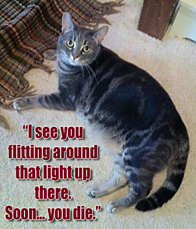 Fortunately for Jazzy, each summer Colorado is besieged with a scourge of small, feathery, disgusting miller moths. The ferocious feline is awakened.